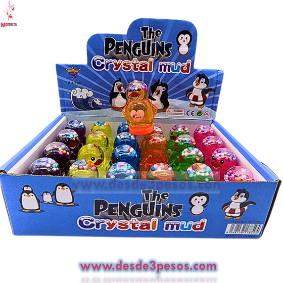 Caja con 24 Pieza de Slime en Figura de PINGUINO colores con glitter y bolitas de unicel 6 cm