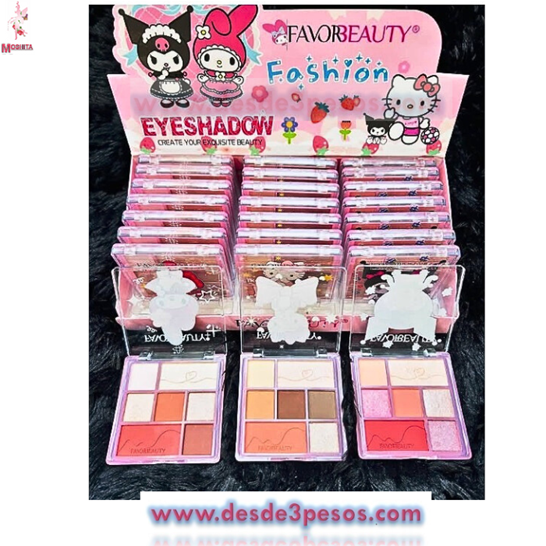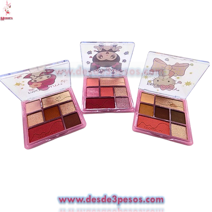 Minipaleta de Rubor con Iluminador 7 tonos FAVOR BEAUTY presentación de personajes 8 x 8 cm. Caja con 24 pza. precio por 1 pza.