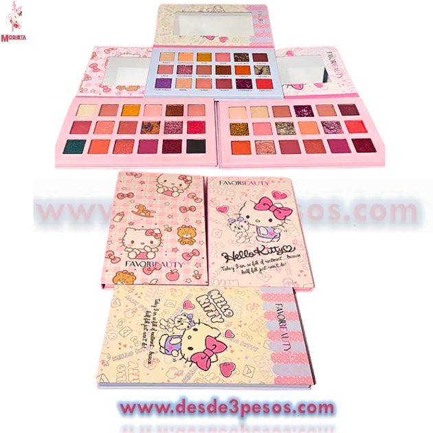 Paleta de Sombras FAVOR BEAUTY HELLO KITTY 18 Tonos Matte y glitter 4 presentaciones 21 x 16.5 cm.