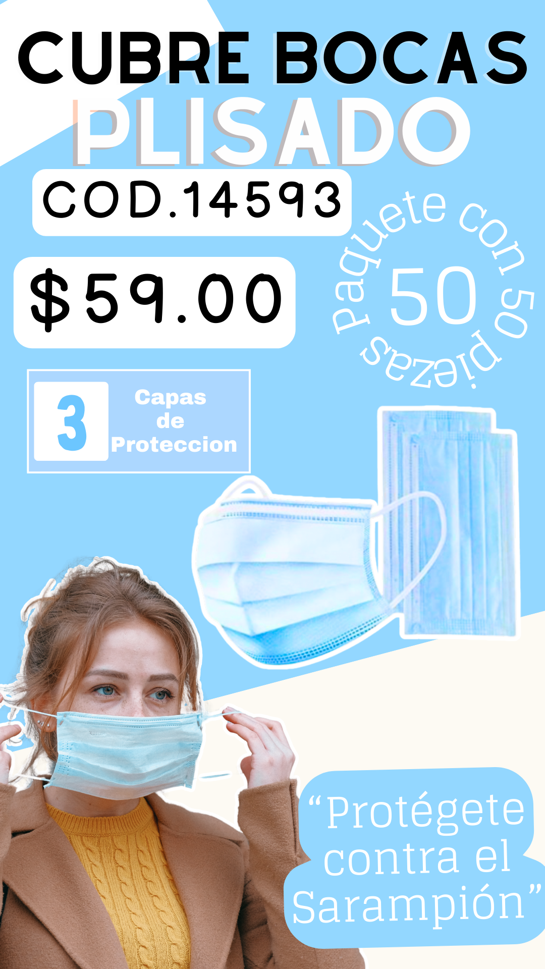 Paquete con 50 piezas de CUBRE BOCAS Color Azul Plisado para Adulto 3 Capas de Proteccion