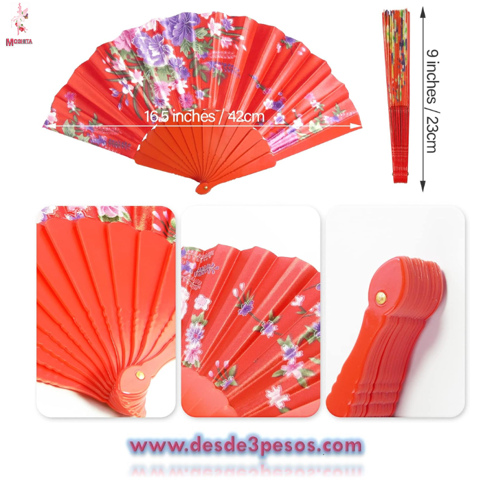 Abanico de plastico,decorado en tela en 6 Colores diferentes 22.5 cm