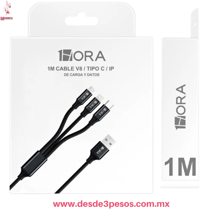 ?Con el Cable 1 Hora 3 en 1 nunca te quedar?s desconectado! ?? Este cable de 1 metro de longitud es la soluci?n definitiva para todos tus dispositivos, combinando las tres conexiones m?s populares en uno solo: V8 (Micro USB): Ideal para una amplia gama de smartphones y accesorios Android. ?? Tipo C: Compatible con los dispositivos m?s modernos y de ?ltima generaci?n. ?? iP (Lightning): Perfecto para tus iPhones, iPads y otros productos Apple. ?? Disfruta de una carga r?pida y eficiente, adem?s de una transferencia de datos ?gil y segura. Su dise?o duradero y pr?ctico lo convierte en el compa?ero perfecto para el hogar, la oficina o tus viajes. ?Simplifica tu vida y lleva la conectividad a otro nivel con 1 Hora!