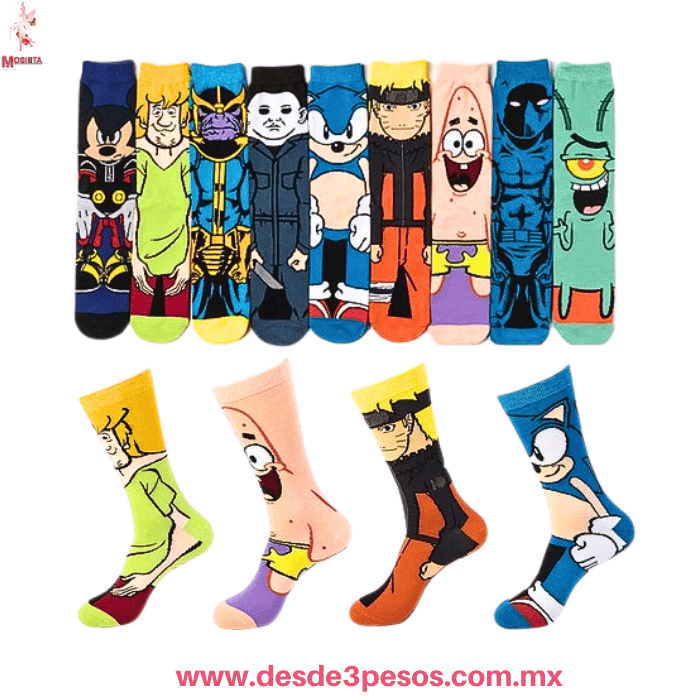 ¡Prepárate para llevar la diversión a tus pies con nuestros increíbles calcetines de personajes! ?? Diseños Únicos y Divertidos: Cada par presenta a tus personajes favoritos de series, películas y videojuegos, como Shaggy, Thanos, Sonic, Naruto, Bob Esponja y muchos más. ¡Hay uno para cada gusto! ? Comodidad Garantizada: Fabricados con materiales suaves y cómodos, perfectos para el uso diario. Tus pies te lo agradecerán.?? Talla Única: Diseñados para adaptarse a la mayoría de las tallas, lo que los convierte en el regalo perfecto o en una adición divertida para tu propia colección.?? Pack de 8 Pares: Obtén una variedad increíble para combinar con tu estilo y estado de ánimo. ¡Nunca te aburrirás!?? ¡Dale un toque de personalidad y alegría a cada paso! Son ideales para regalar o para darte un capricho. ¿A qué esperas para tener los tuyos? ¡No te quedes sin ellos!??