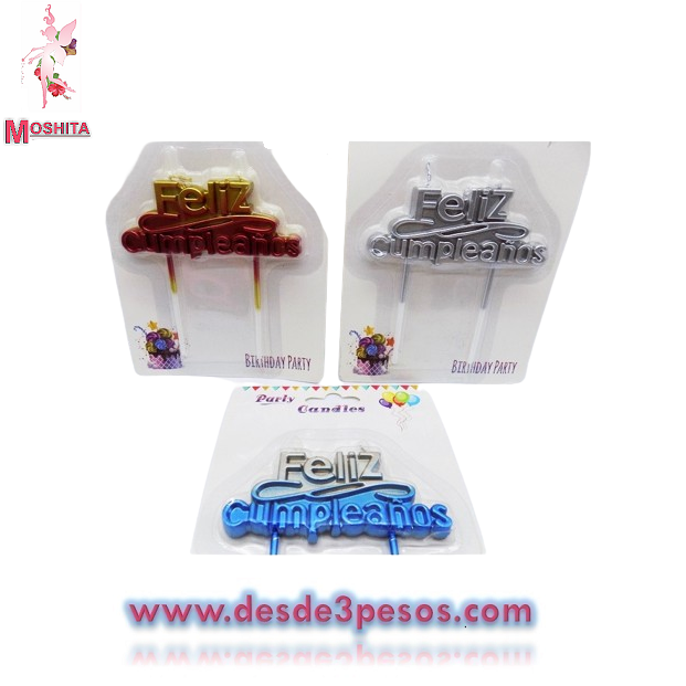 Carton de 1 Vela con la frase FELIZ CUMPLEAÑOS material plástico cromado en colores como foto 9 x 9 cm