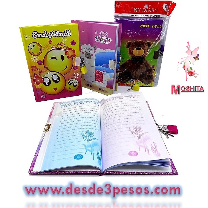 Diario mediano, hojas estampadas, con candado, pasta dura. Medidas 19X 13 cm