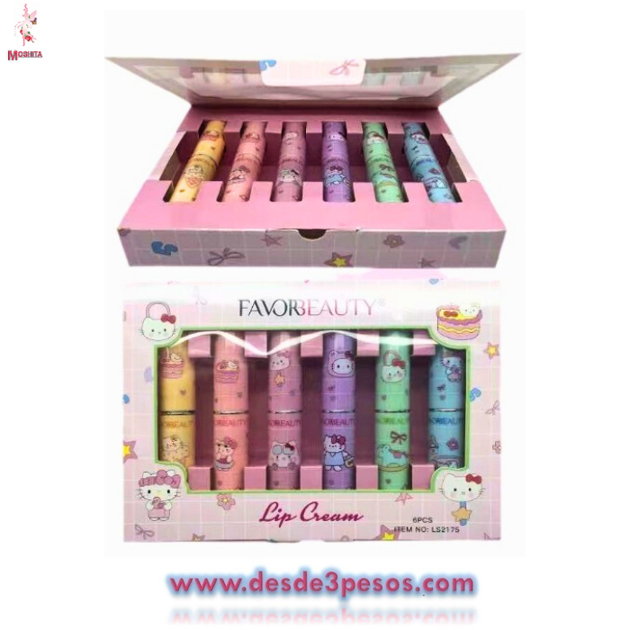 Estuche con 6 Labiales en diferente tono con Aromas Frutales FAVOR BEAUTY 8 X 1.5cm.