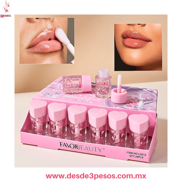 Lip Gloss Brillo en forma de Corazon FAVOR BEAUTY con destellos de Figuras 6 x 3 cm. Caja con 24 pza. precio por 1 pza. LG3822