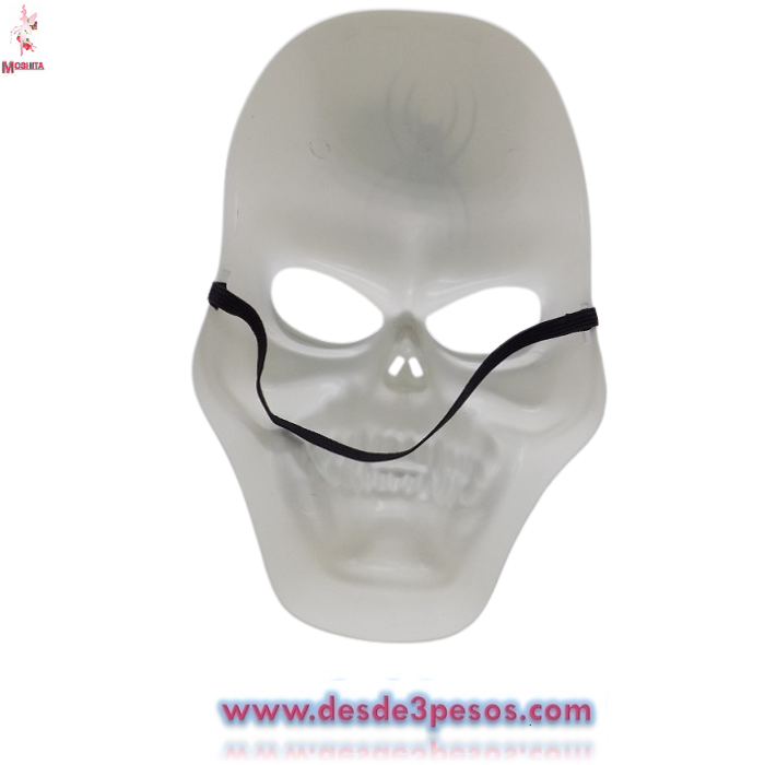 Mascara de Plastico Duro en forma de Calavera Decorada con Araña en color Blanco 26 x 16cm.