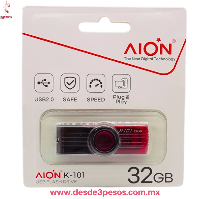 ?Guarda tus recuerdos y archivos importantes con estilo y seguridad! ?? Presentamos la AION K-101 USB Flash Drive de 32GB, tu compa?era ideal para llevar informaci?n a todas partes. Este dispositivo no solo es compacto y elegante, sino que tambi?n ofrece un rendimiento excepcional para todas tus necesidades de almacenamiento. ? Caracter?sticas destacadas: Capacidad de 32GB: Espacio de sobra para fotos, videos, documentos y m?s. ?? Conexi?n USB 2.0: Transferencias r?pidas y eficientes, sin demoras. ? Plug & Play: Con?ctala y ?sala al instante, sin instalaciones complicadas. ?As? de f?cil! ?? Seguridad garantizada: Tus datos estar?n protegidos, brind?ndote total tranquilidad. ??? Dise?o moderno y duradero: Con un toque de rojo vibrante, es tan atractiva como funcional. ?? Ya sea para el trabajo, la escuela o tus aventuras personales, la AION K-101 es la soluci?n perfecta. ?No dejes pasar la oportunidad de tener tus archivos siempre contigo, de forma segura y accesible! ?Consigue la tuya hoy mismo! ??