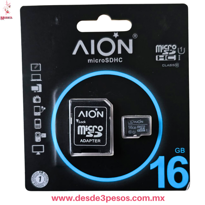 ?Captura cada momento y lleva tu mundo contigo! ?? Con la tarjeta Micro SD AION de 16GB, tendr?s espacio de sobra para fotos ??, videos en Full HD ??, aplicaciones y todos tus archivos importantes. Caracter?sticas que te encantar?n: 16GB de Almacenamiento: Ampl?a la memoria de tu smartphone, tablet, c?mara o dron. ?Nunca m?s te quedar?s sin espacio! ?? Alta Velocidad (Clase 10): Disfruta de una transferencia de datos ultrarr?pida, ideal para grabar videos sin interrupciones y mover archivos en segundos. ? Adaptador SD Incluido: ?sala con facilidad en cualquier dispositivo compatible con tarjetas SD, como tu laptop o c?maras profesionales. ?Versatilidad al m?ximo! ? Marca AION: Confianza y rendimiento garantizados para proteger tus recuerdos y datos. ?No esperes m?s! Dale a tus dispositivos el almacenamiento que necesitan y lleva tu experiencia digital al siguiente nivel. ?Haz clic y compra la tuya ahora! ??
