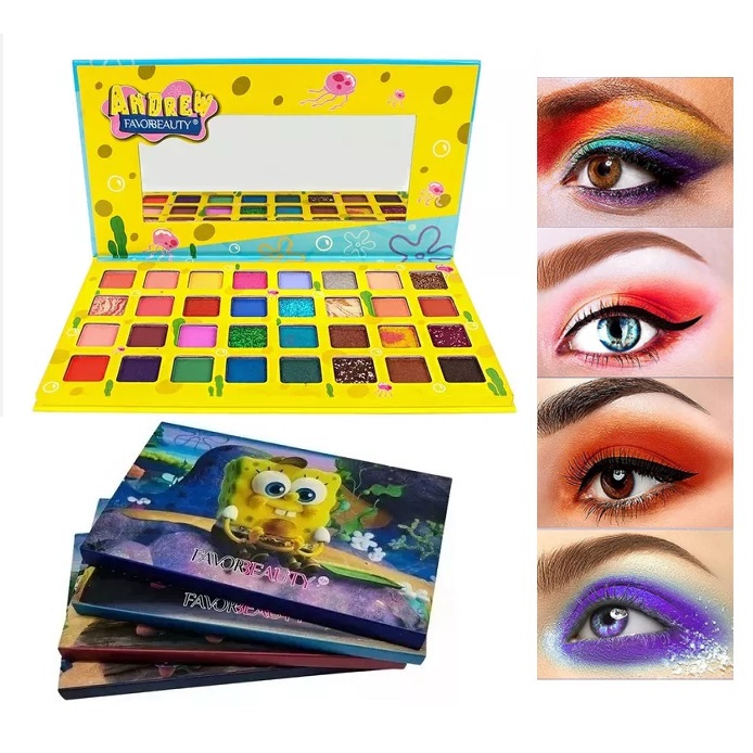 Paleta de Sombras Bob Esponja 32 Tonos con espejo tonos matte, gliter y marmoleados 23 x 12cm.