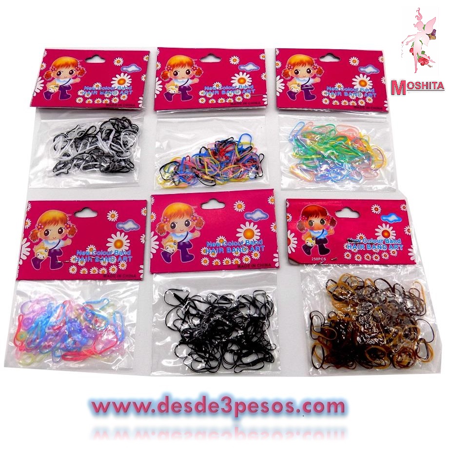 Paquete con 12 Bolsas de Liga latex para cabello contenido 200 pzas en bolsa en varios colores