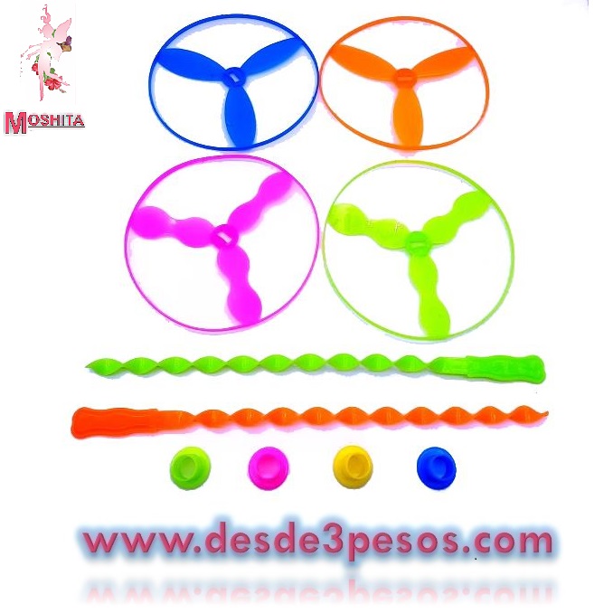 Paquete con 40 pzas de Juguete Helice, con impulsador para que vuele alto. 4 Colores, Diametro 14 cms.