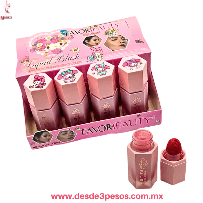 | Rubor LÃquido FAVOR BEAUTY Hello Kitty con Aplicador de Esponja, 8 x 3.5cm. Larga Duración 4 tonos BL9107